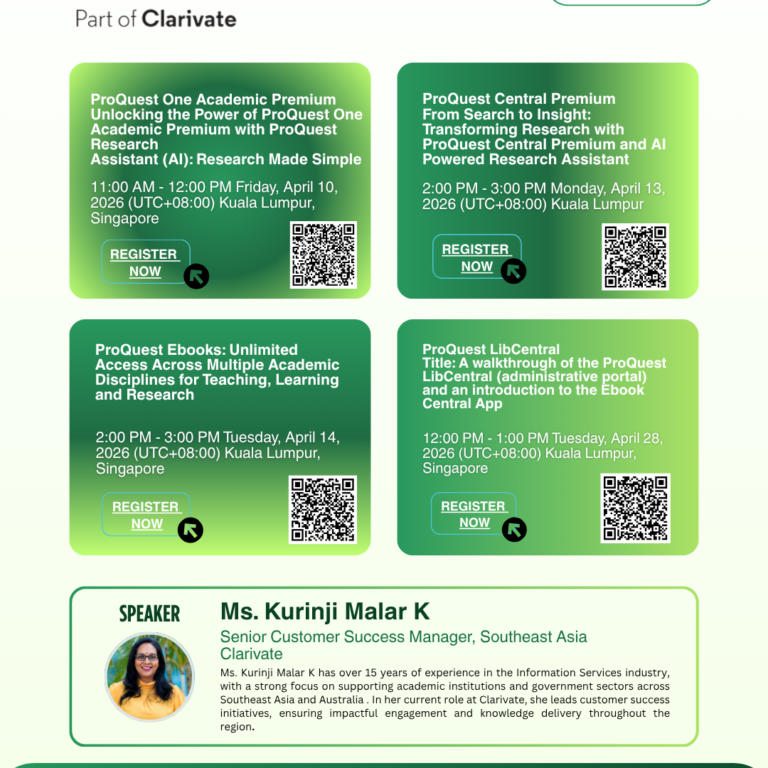 WEBINAR Clarivate Public Webinar Series April 2026 Friday, 10 April, 2026 | 11:00 AM – 12:00 PM (GMT+8) Monday, 13 April, 2026 | 2:00 PM – 3:00 PM (GMT+8) Tuesday,…