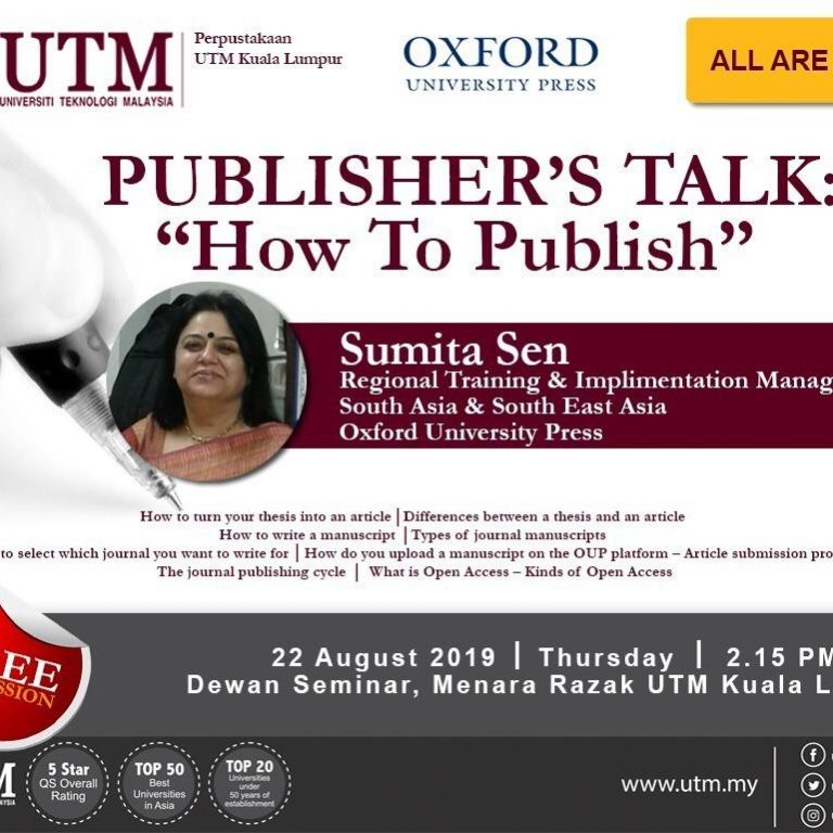 Date : 22nd August 2019 Venue : Menara Razak Universiti Teknologi Malaysia (UTM KL) Topic : Publishing Talk : “How to Publish” by Sumita Sen Regional Training & Implementation Manager| South…