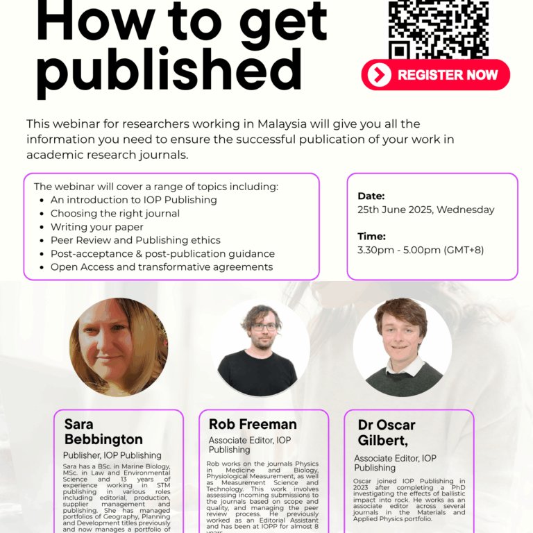 WEBINAR IOP Publishing: How to get Published Webinar Wednesday, June 25, 2025 | 15:30 PM – 17:00 PM (GMT+8) Register Now Join us to learn: This webinar for researchers working…